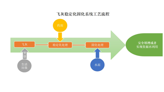 工藝技術(shù):采用以藥劑穩(wěn)定化為主、水泥基固化法為輔的工藝處理技術(shù)。通過藥劑的加入將飛灰內(nèi)的重金屬等有毒有害分子通過化學(xué)反應(yīng)進行穩(wěn)定化處理,再利用惰性基材水泥與水反應(yīng)后可形成堅固塊體的特征,將有害廢物包容在緊密固化體中,使其中所有污染組分呈現(xiàn)化學(xué)惰性或被包容起來,減少重金屬對周圍環(huán)境的污染。經(jīng)過成型處理的飛灰混合物料具有低毒性、低溶解性、低遷移性,能在較為安全的條件下運輸與處置。